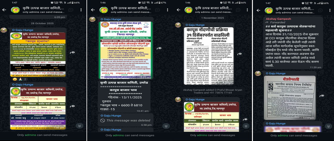 Farmers are informed about the market prices, instructions, programs, and schemes of the Market Committee through WhatsApp messages.